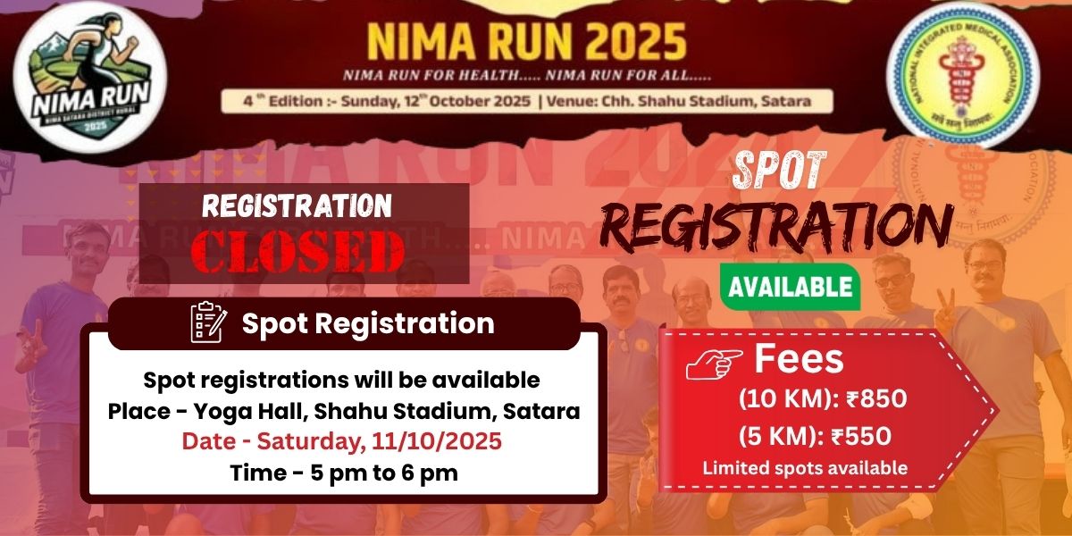 Join us for the 4th edition of NIMA RUN on Sunday, 12th October 2025 at Chhatrapati Shahu Stadium, Satara. Organized by NIMA Satara District (Rural), this inspiring event features 10 KM and 5 KM run categories - promoting fitness, unity, and a healthier tomorrow.